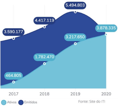 No gráfico é possível observar a relação de certificados emitidos e ativos de 2017 à 2020 e ver uma crescente considerável.